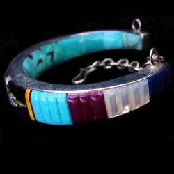Damenarmband aus Sterlingsilber/925, Zuni, besetzt mit fein handgeschliffenen mehrfarbigen Steinen mit 10 türkisfarbenen Cabochons in der Mitte. Breite 3,5 cm.