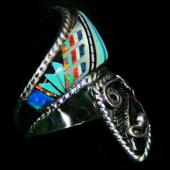 Ring aus Sterlingsilber/925er-Silber, besetzt mit mosaikartig angeordneten Halbedelsteinen, die ein Symbol der amerikanischen Ureinwohner, den Sonnengott, darstellen.