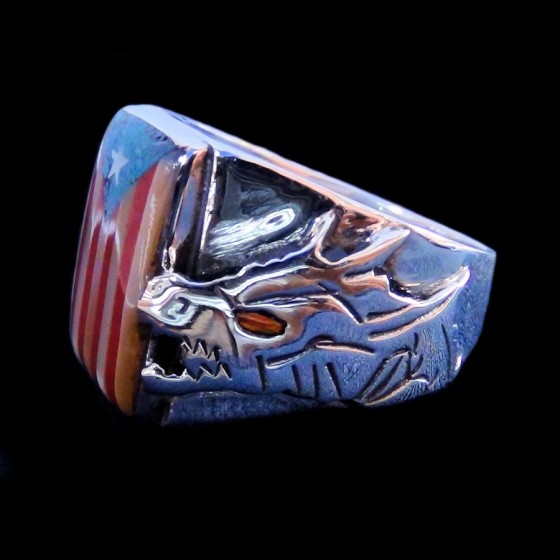Ring aus massivem 925er Silber, verziert mit einem handgemeißelten Drachen auf jeder Seite und besetzt mit einer texanischen Flagge, in Koralle, Perlmutt und Türkis.