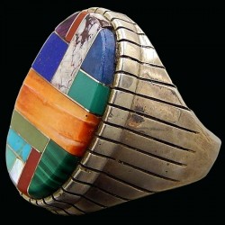 Ring aus Sterlingsilber/925, besetzt mit mehrfarbigen Halbedelsteinen, die auf jeder Seite ein Navajo-Muster mit einem Donnervogel-Relief bilden.