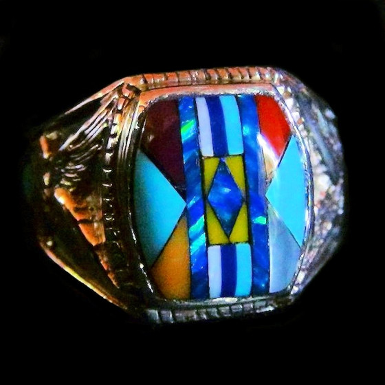 Ring aus Sterlingsilber/925, der ein indisches Symbol mit Halbedelsteinen aus Mosaik darstellt – fein handgeschliffene Einlage. Auf jeder Seite ein Adler im Relief mit einem kleinen Türkis.