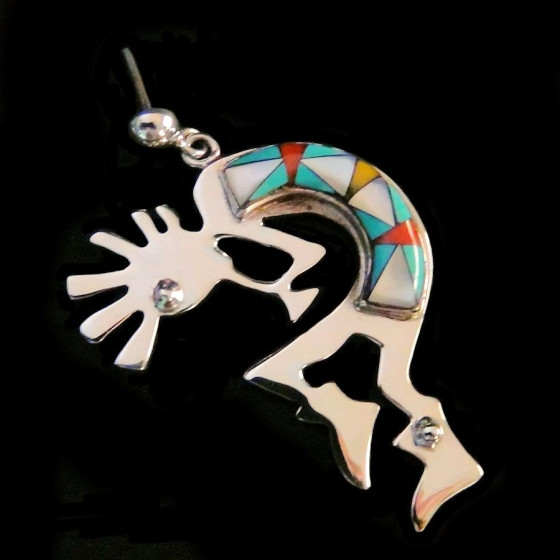 Gedrehte Ohrringe aus 925er Sterlingsilber, besetzt mit mehrfarbigen Steinen, die den Zuni-Sonnengott darstellen.