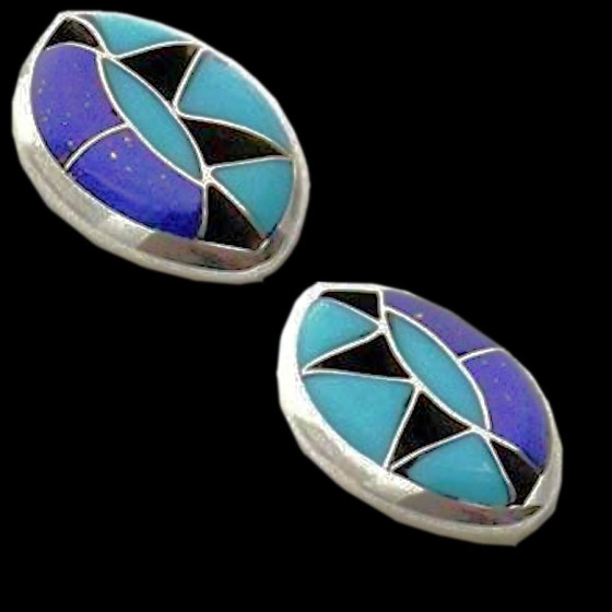 Ohrringe aus Sterlingsilber/925 mit einem Mosaik aus Steinen, die den Sonnengott Zuni darstellen.