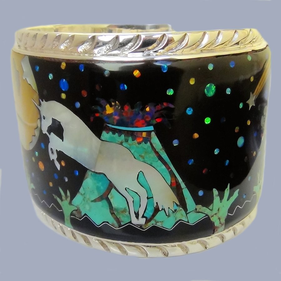 Armband aus Sterling/925 Silber, besetzt mit mehrfarbigen Steinen und Opalen, die eine Szene mit einem Einhorn und einem Pegasus darstellen, vollständig von Hand gezeichnet und gemeißelt.