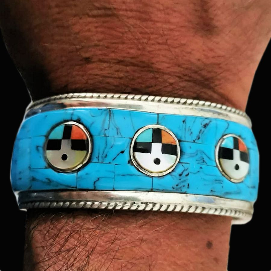 Armband geschmückt mit drei Gesichtern des Zuni-Sonnengottes auf einem türkisfarbenen Hintergrund.