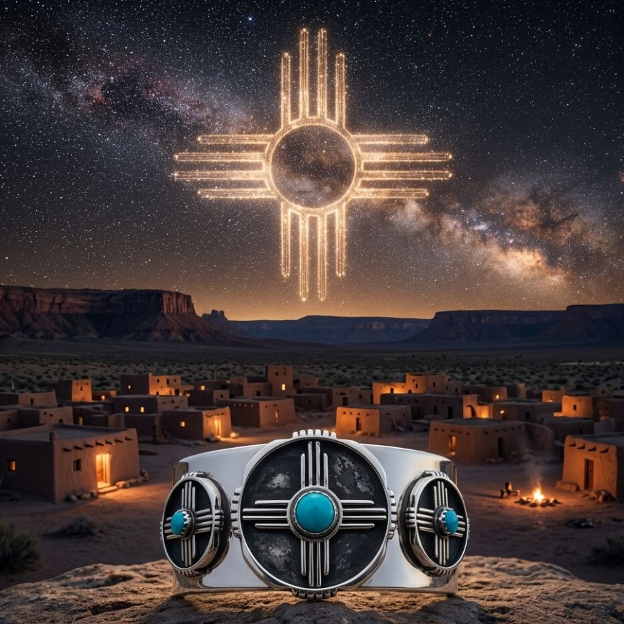 Das Zia-Symbol, das vom Zia-Pueblo-Stamm in New Mexico stammt, ist ein heiliges Motiv, das die Sonne mit vier Gruppen zu je vier Strahlen darstellt. Es wird häufig auf Armbändern abgebildet. Dieses Symbol wird oft von indigenen Künstlern Nordamerikas, insbesondere von den Navajo und Zuni, verwendet, um Harmonie und universelles Gleichgewicht zu verkörpern.