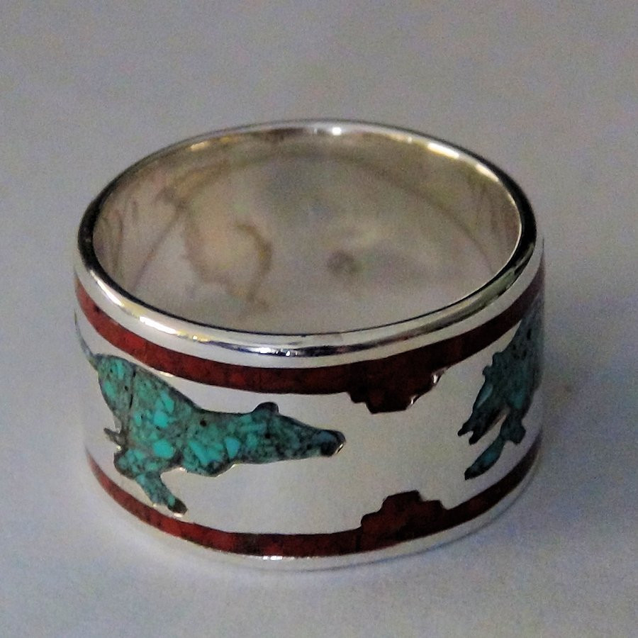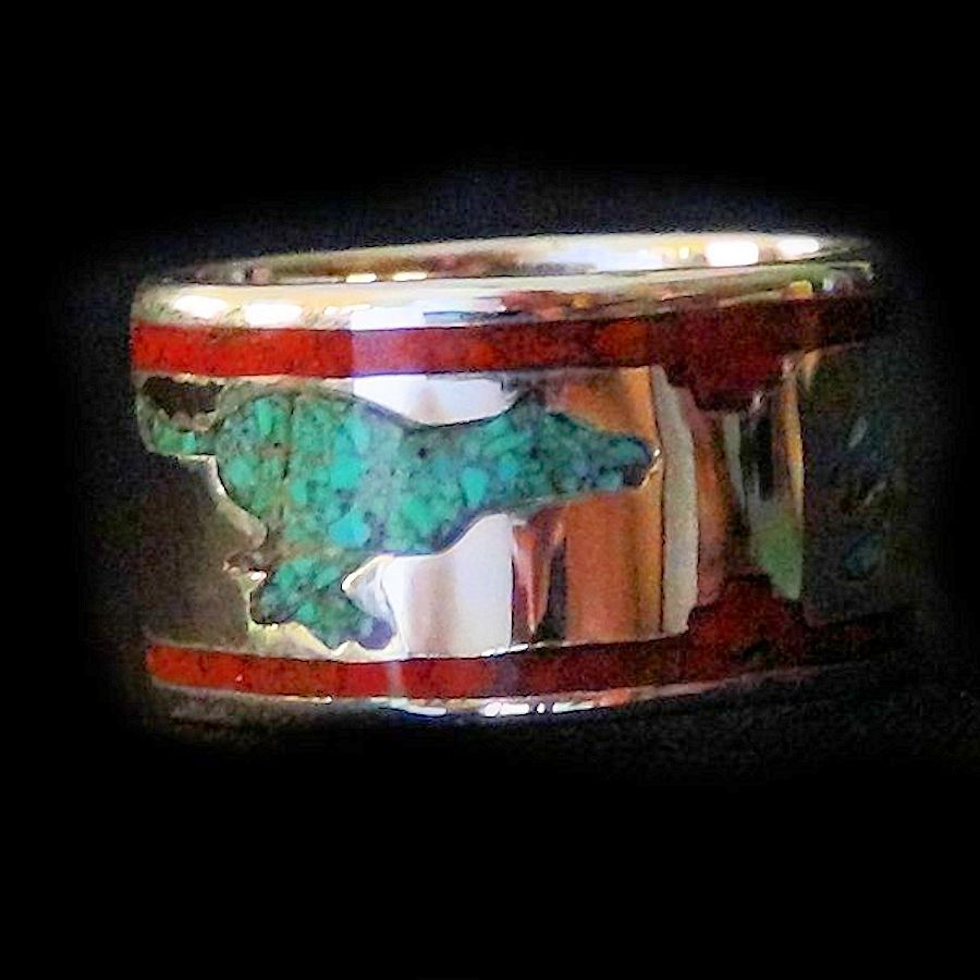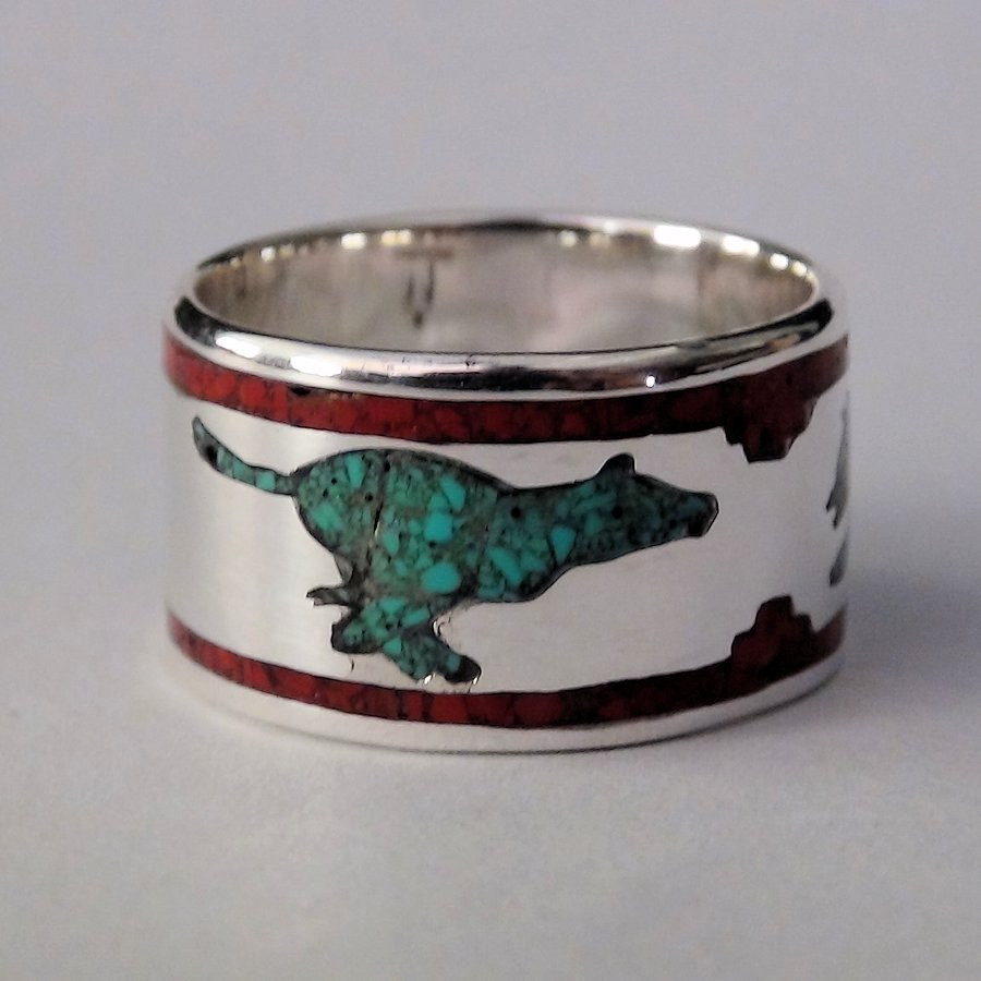 Ring aus Silber 925, ein Zentimeter breit gemeißelt mit zwei Wölfen im Muster, der Wolf ist in Türkis und die Einfassung in Koralle rot.