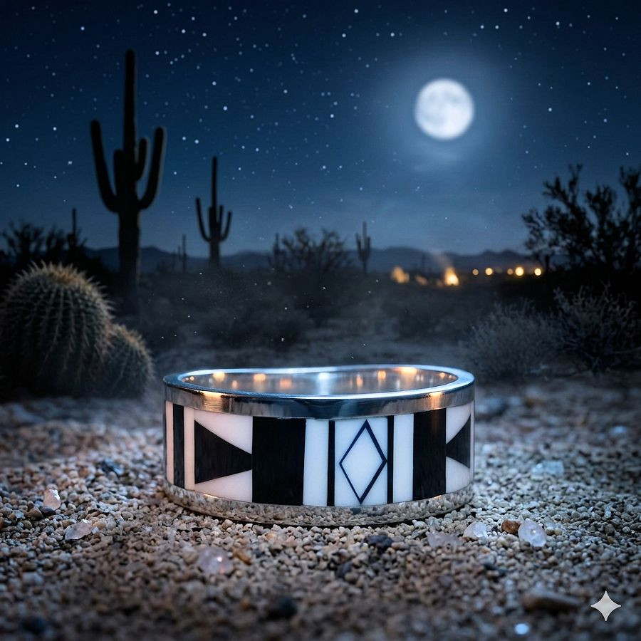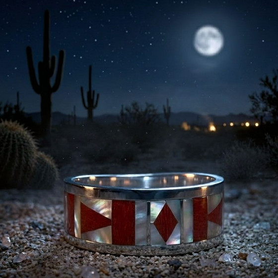 Sterling silber bandring für Damen und für Herren mit Perlmutt und schwarz mosaïk..