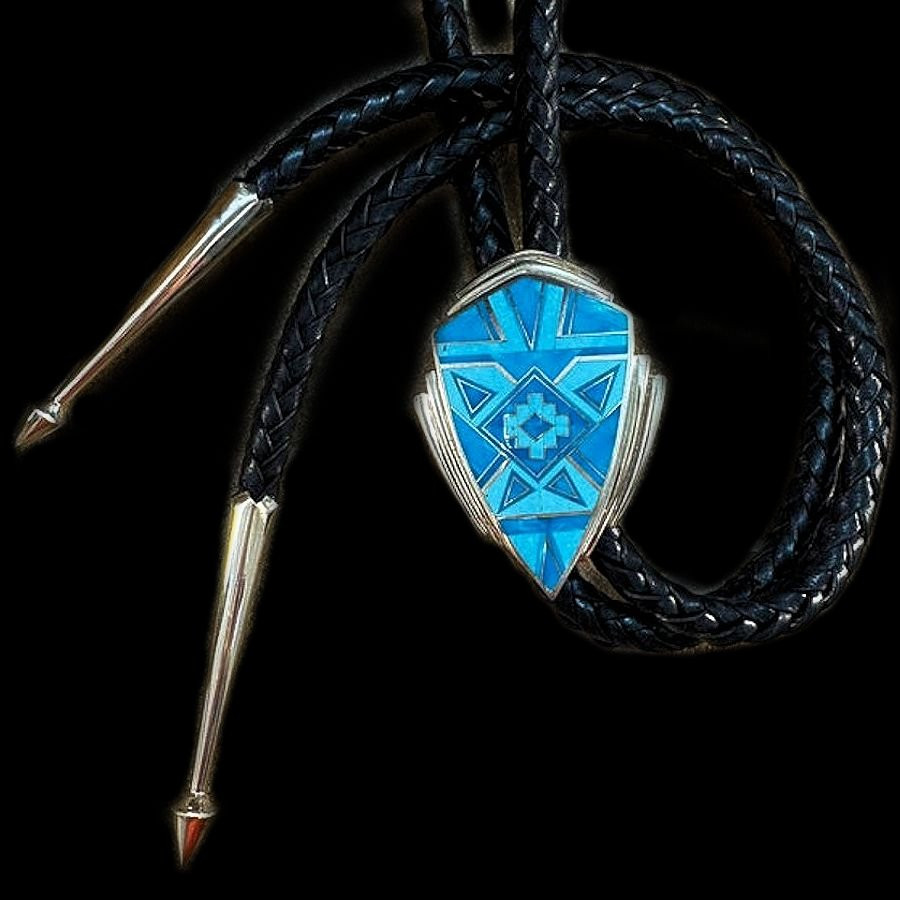 Bolotie aus Sterlingsilber/925, verziert mit einem Navajo-Symbol und türkisfarbenem Mosaik.