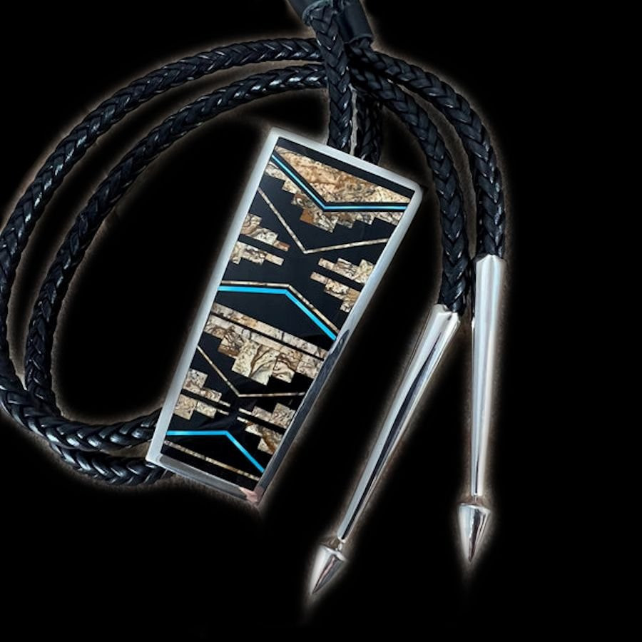 Bolotie aus Sterlingsilber/925, verziert mit einem Navajo-Symbol und einem Mosaik aus Türkis und Gagat.