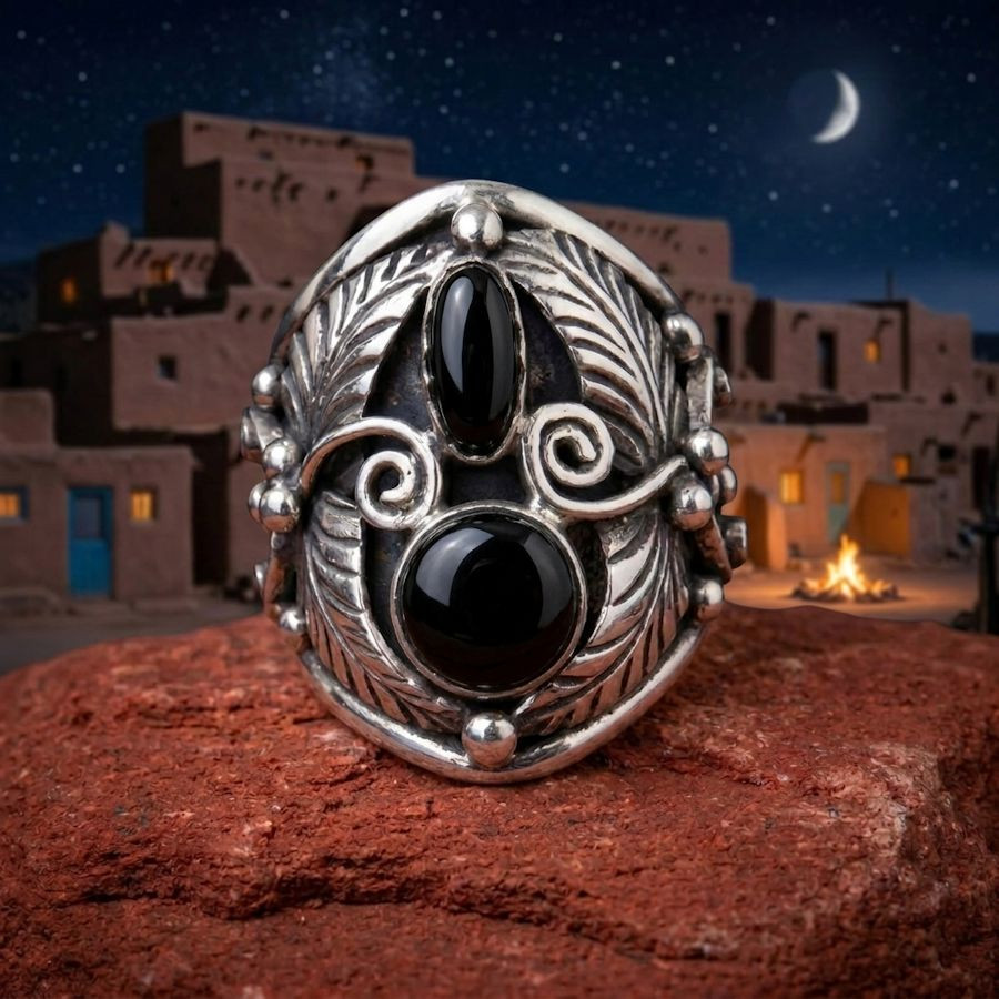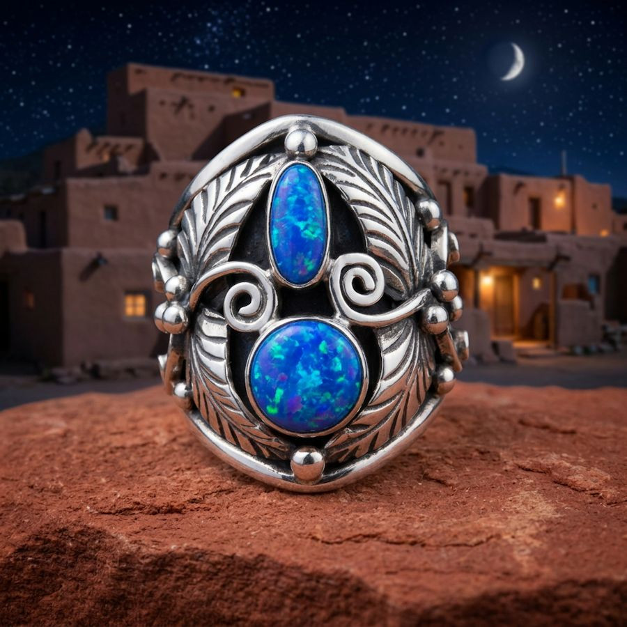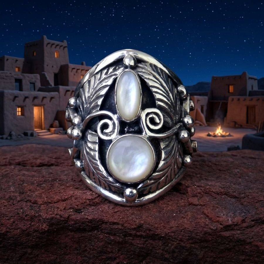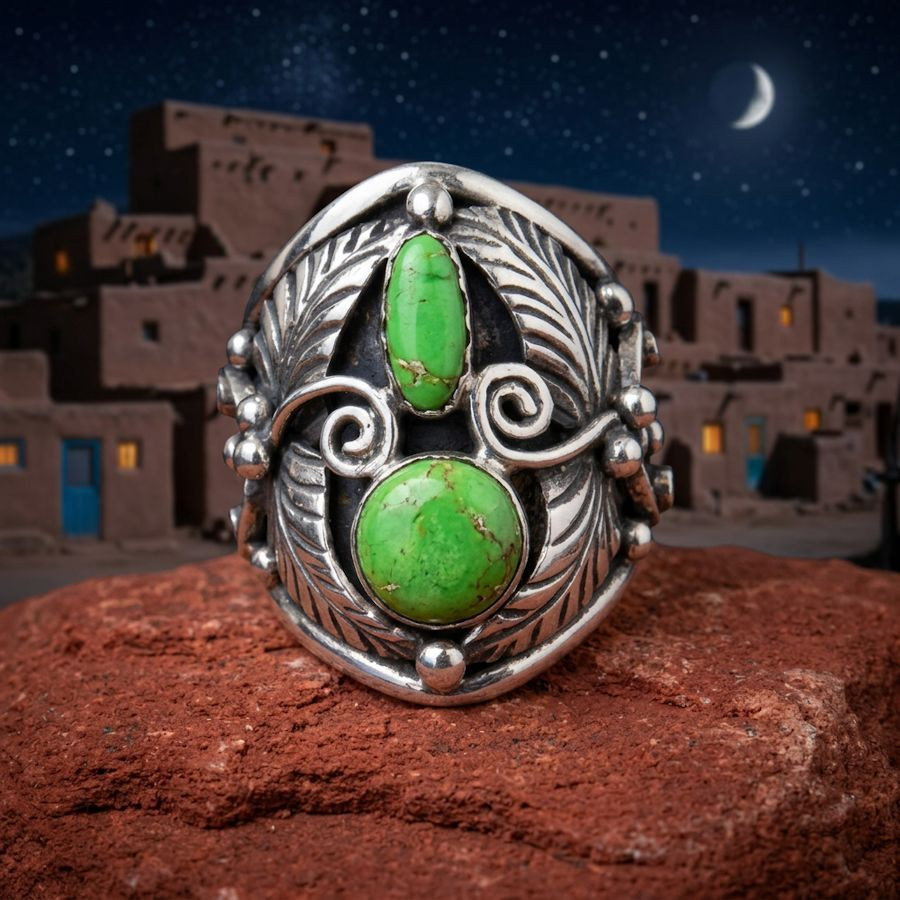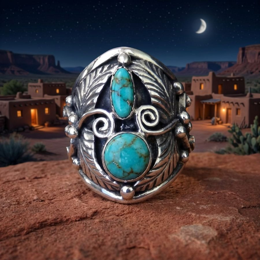Ringe der amerikanischen Ureinwohner, verziert mit Federn und zwei Steinen, sind ikonische Zeugnisse südwestamerikanischer Handwerkskunst. Sie werden von Künstlern der Navajo, Hopi oder Zuni aus 925er Sterlingsilber gefertigt.
