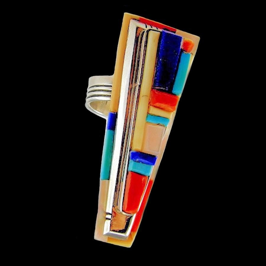 Ring aus Sterling/925 Silber, besetzt mit Türkis, Lapislazuli, Koralle und Perlmutt.