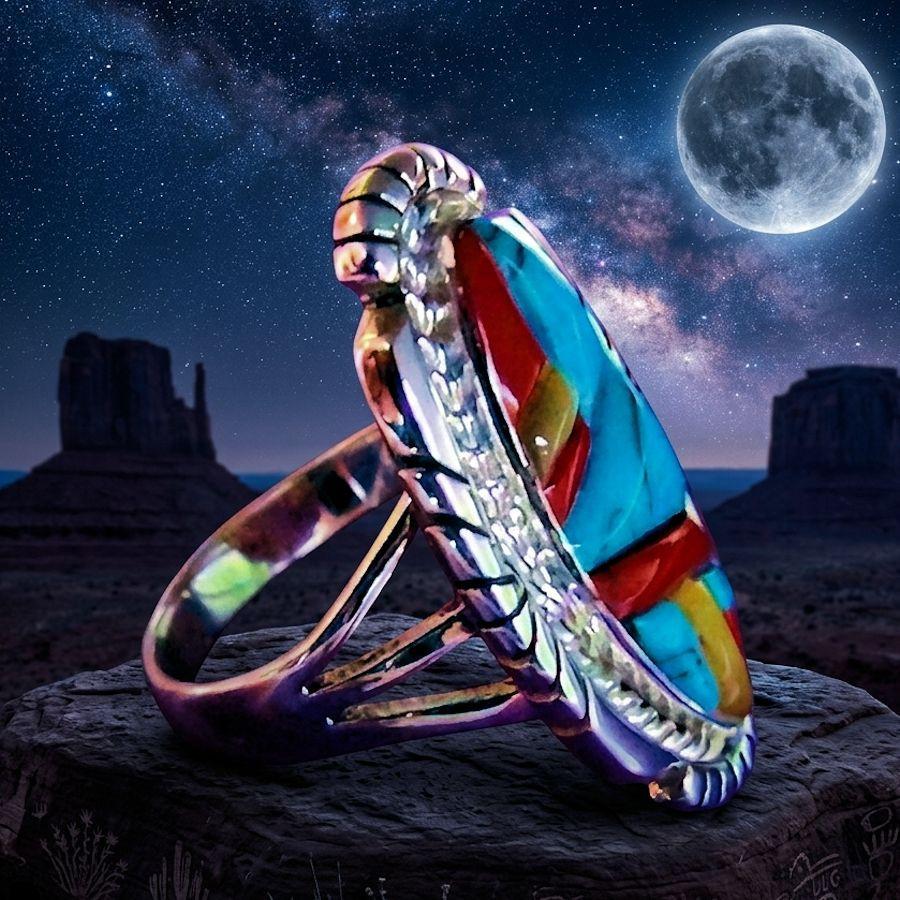 Der ovale Mosaikring mit Türkis, Koralle und Perlmutt ist ein ikonisches Beispiel indianischer Handwerkskunst und besonders in den Kulturen der Zuni und Navajo hoch geschätzt. Diese Schmuckstücke zeichnen sich durch eine Intarsientechnik aus, bei der echte Steine von Hand zugeschnitten und zu geometrischen oder figürlichen Reliefs zusammengesetzt werden. Zu den zentralen Steinen gehören Türkis, rote Koralle, Perlmutt (weiß oder gelb) und manchmal Onyx oder Gagat als Kontrast.