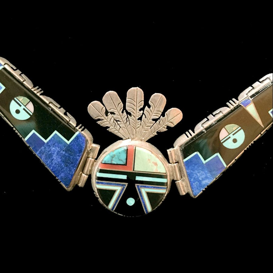 Halskette aus Sterlingsilber, besetzt mit Halbedelsteinen, die den Sonnengott Zuni darstellen.