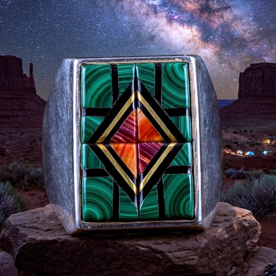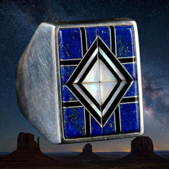 Rechteckige Navajo-Ringe mit der Overlay-Technik (Silberschichten) sind ikonische Schmuckstücke indianischer Handwerkskunst aus dem Südwesten der USA. Diese Schmuckstücke sind in verschiedenen Stilen und mit unterschiedlichen Halbedelsteinen erhältlich: