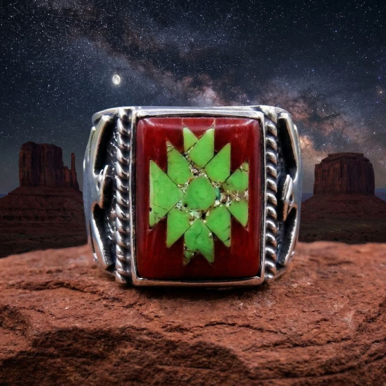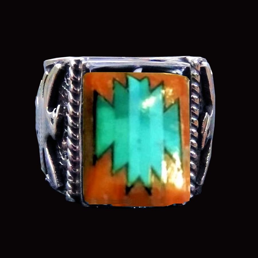 Ring aus Sterlingsilber/925, besetzt mit mehrfarbigen Halbedelsteinen, die auf jeder Seite ein Navajo-Muster mit einem Donnervogel-Relief bilden.