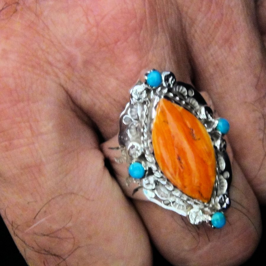 Sterling/925-Silberring für Herren, fein von Hand gemeißelt und mit Muschel und vier Türkis-Cabochons besetzt.