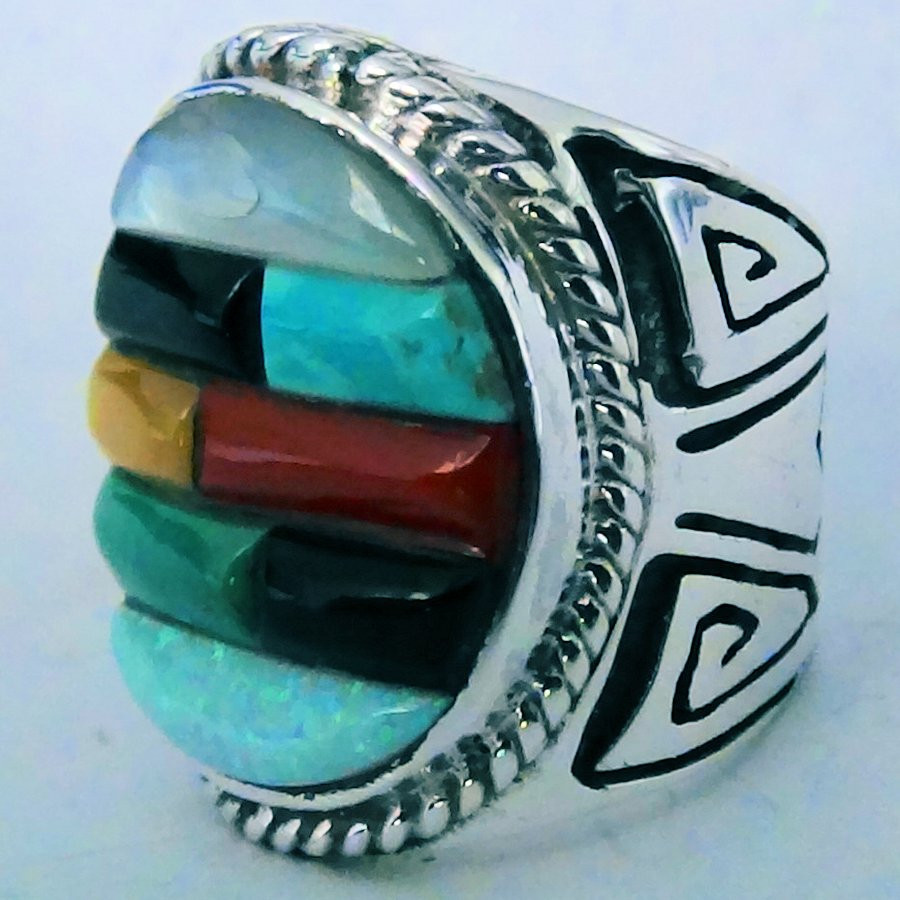 Ring aus Sterlingsilber/925, besetzt mit mehrfarbigen, in Cobblestone geschliffenen Steinen und verziert mit einem Navajo-Motiv an den Seiten.