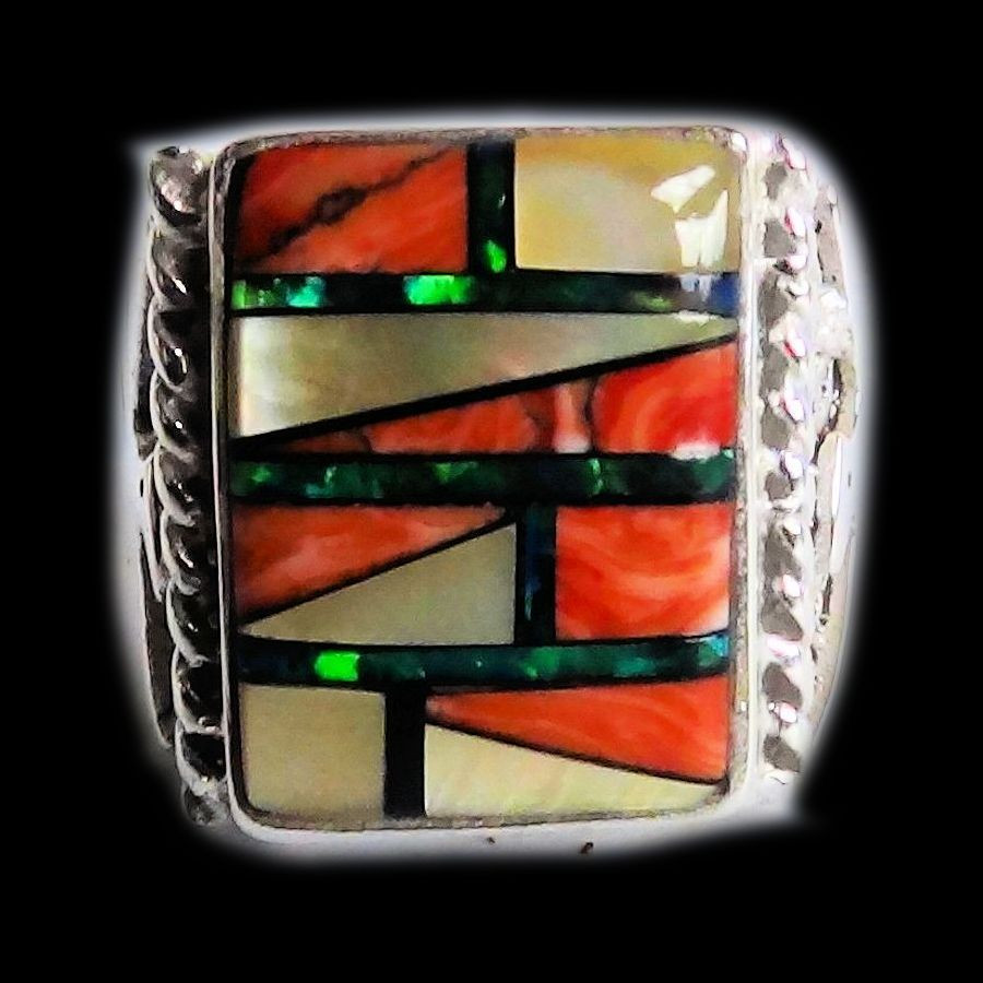 Ring aus Sterlingsilber/925 mit Perlmutt, Opalit und roten Gagatsteinen, die ein Navajo-Motiv mit einem Donnervogel-Relief auf beiden Seiten bilden.