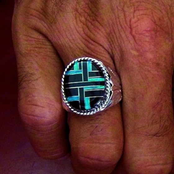 Ovaler Ring aus Silber, Zuni, Kanaleinlage, Opal und schwarzem Jeais