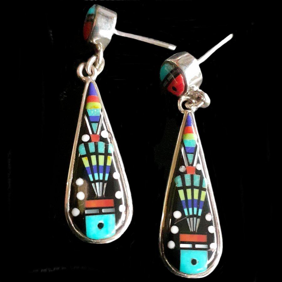 Ohrringe aus Sterlingsilber/925, in Form eines Regentropfens geschnitzt, ca. 1,2 x 4 cm groß und mit kleinen Mosaiksteinen besetzt, die eine Kashina darstellen. Gewicht einer Schlaufe 5 g.