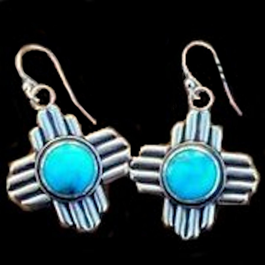 Ohrringe mit dem Zia-Symbol (der heiligen Sonne des Zia-Pueblo-Volkes) sind ikonische Schmuckstücke des amerikanischen Südwestens. Dieses Symbol repräsentiert das Gleichgewicht des Lebens durch vier Gruppen von je vier Strahlen, die die Himmelsrichtungen, die Jahreszeiten, die Lebensphasen und die Tageszeiten symbolisieren.
