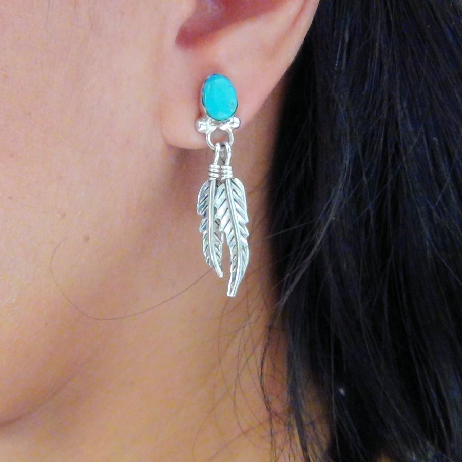 Sterlingsilber Ohrstecker im Navajo Stil mit zwei Nuggets in Kronfassung und zwei Sterlingfedern - Abmessungen-Muster ca A 4 x C 0.7 cm - Ein Ohrring wiegt 4,5 g.