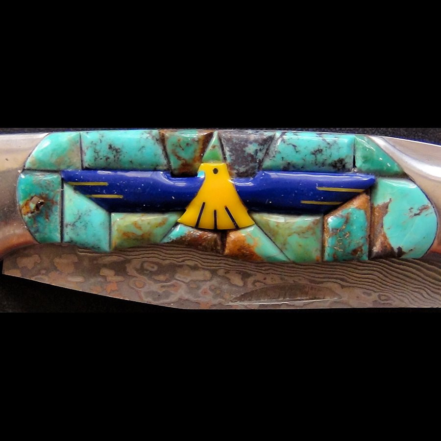 Klappmesser, dessen Griff mit Türkis und einem Donnervogel besetzt ist.