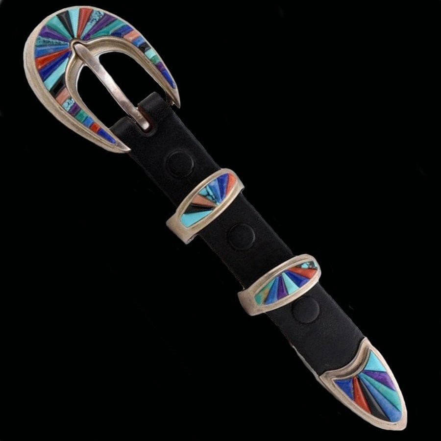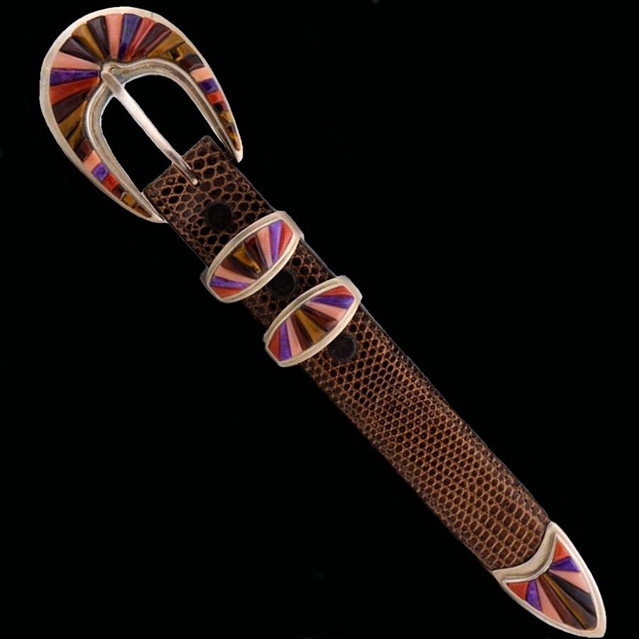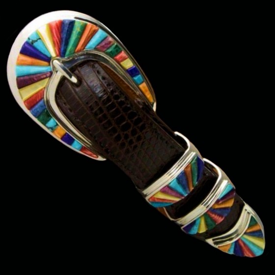 Handgemeißelte Gürtelschnalle aus 925er Silber, besetzt mit Halbedelsteinen.