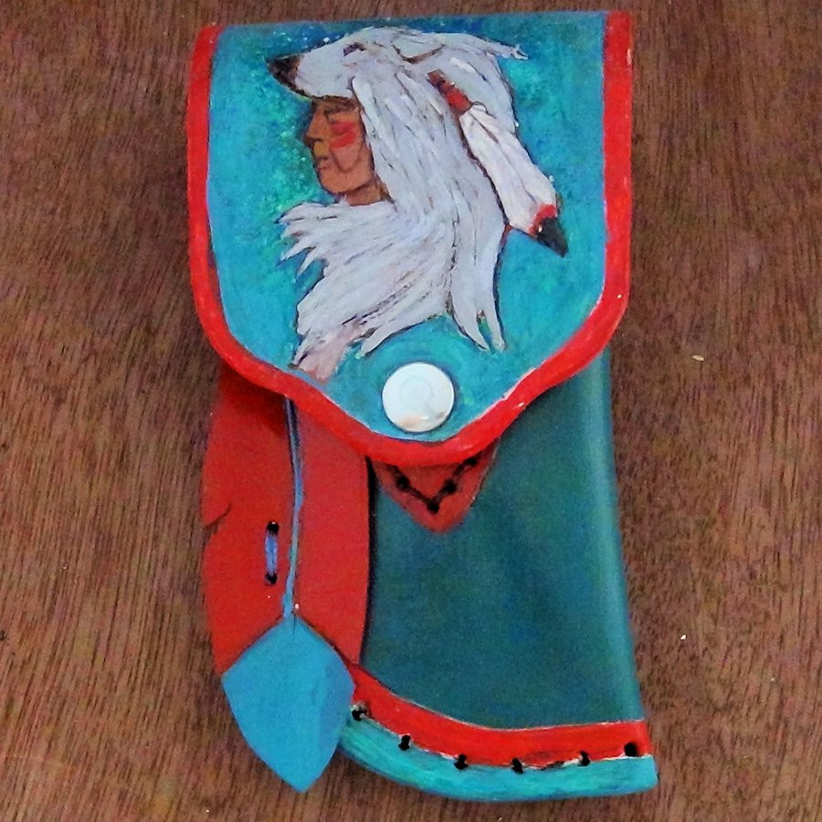 Geprägte und handbemalte Lederscheide für ein Messer von maximal 11,5 cm.
