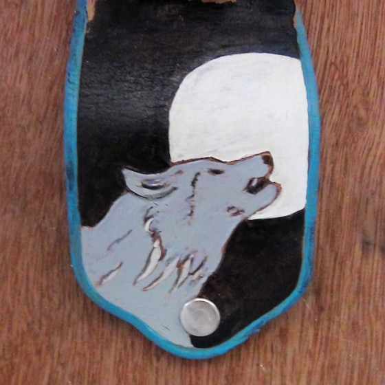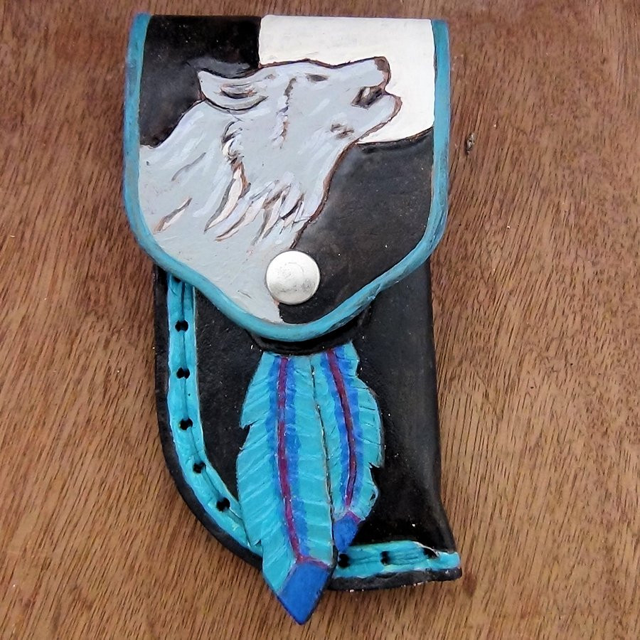 Geprägte und handbemalte Lederscheide für ein Messer mit einer maximalen Länge von 12 cm.