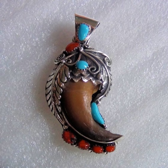 Sterling Silver pendant finely chiseled by hand and adorned with a real bear claw, turquoise and coral cabochons. Weight about 40g.