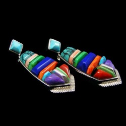 Zuni Sterlingsilver Earrings with a multi color gemstones Inlay measures 3.8 x 1.8 cms.