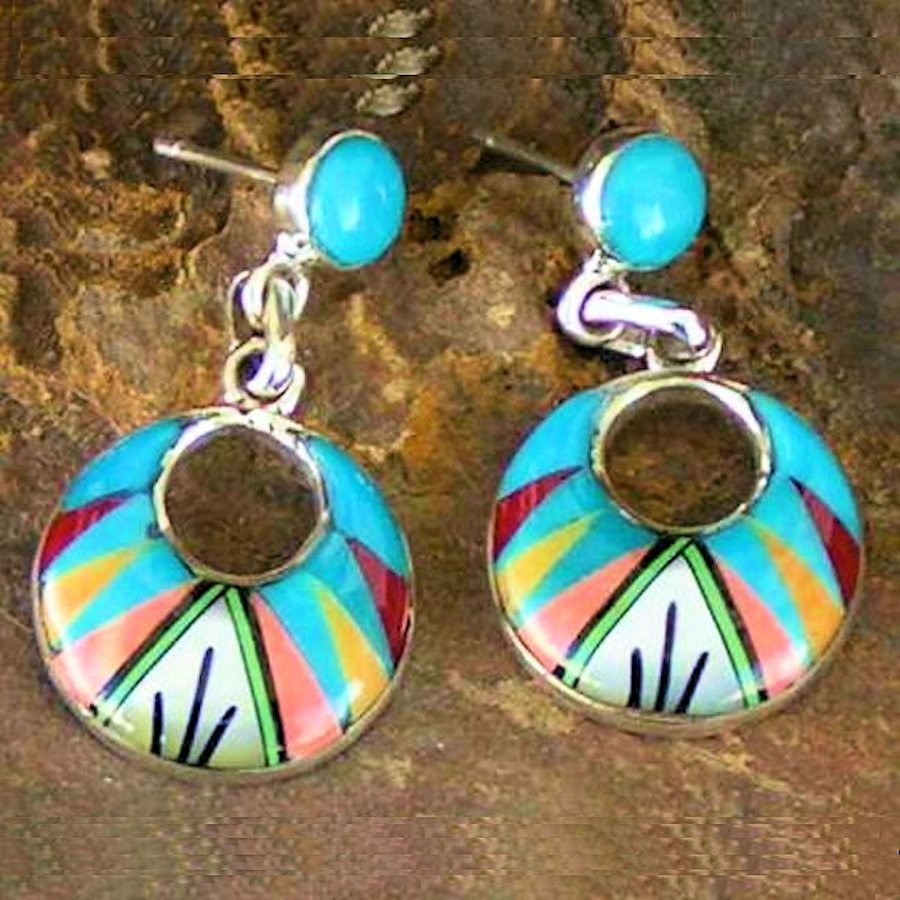 Sterling silver earrings which measure 25/32" x 1-3/8" app. With an Inlay of semi-precious stones.