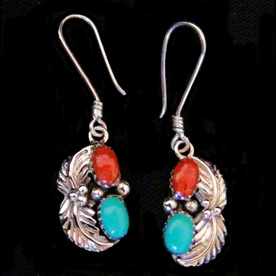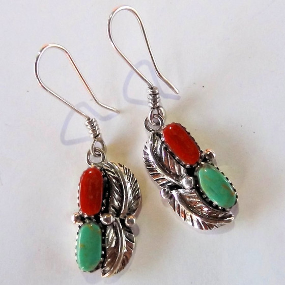Sterling silver earrings with two feather, one cabochons of turquoise and one cabochon of red coral. Dimensions 25/32" x 15/32" approx.