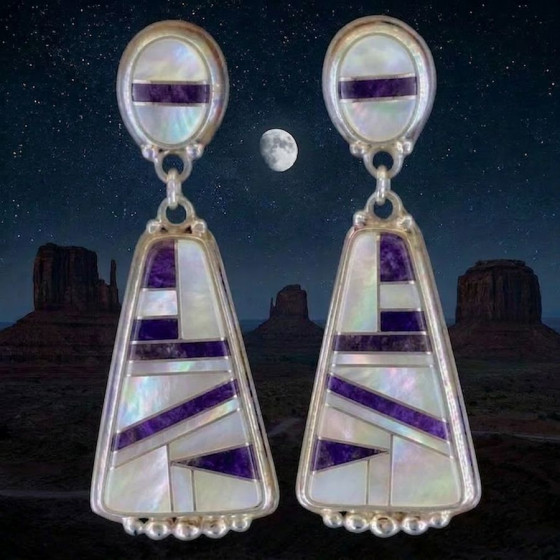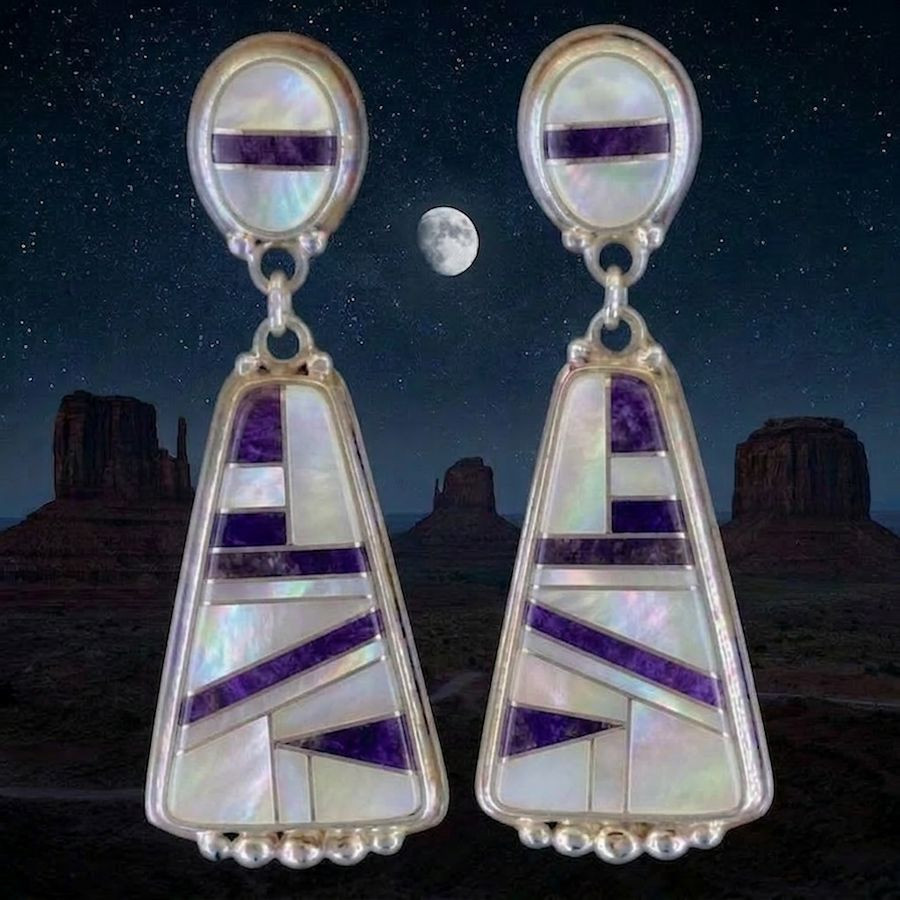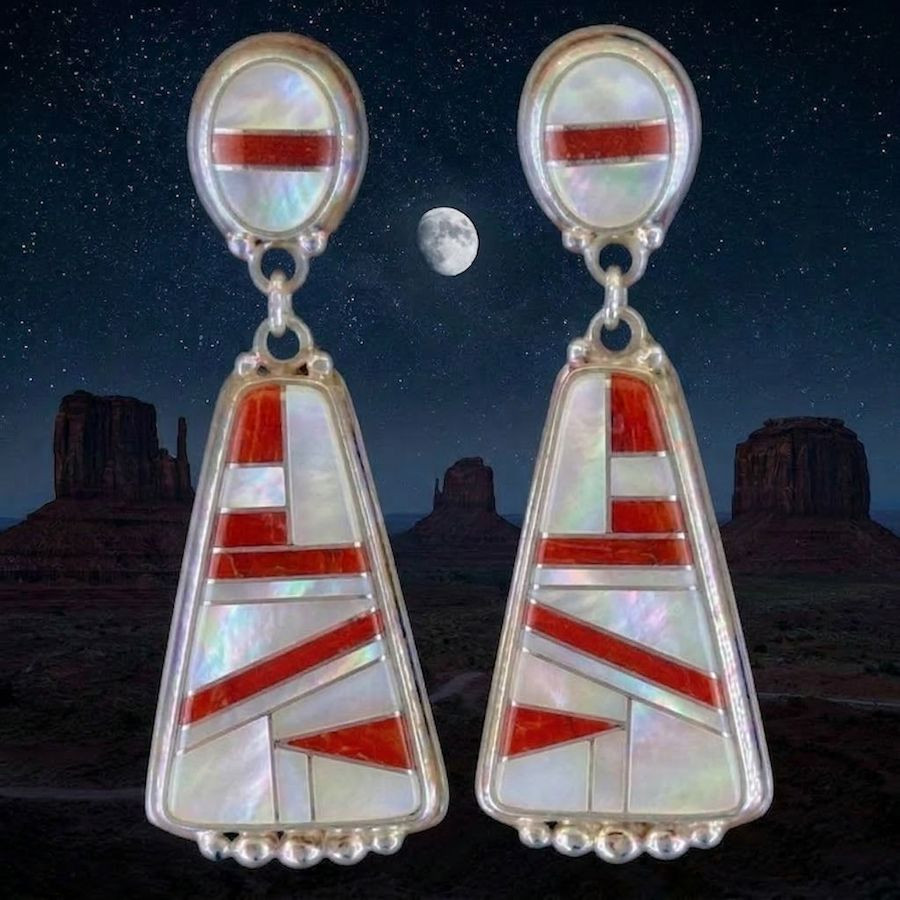 Sterling silver/925 earrings set with turquoise, mother-of-pearl, and coral. Weight per earring: 8 g.
