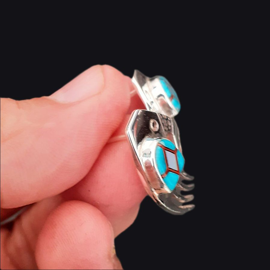 Navajo Bear Paw earrings are iconic pieces of Native American craftsmanship, often symbolizing protection, strength, and healing power. They are traditionally made of 925 sterling silver and set with genuine turquoise, a sacred stone considered a "piece of heaven fallen to earth."