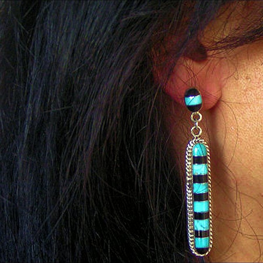 Earrings in Sterling/925 Silver, long, measuring 6 x 0.8 cm and set with Sleeping Beauty turquoise and black jasper.