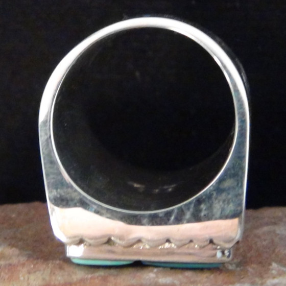 Hand chiseled Sterling Silver ring with Turquoise and Coral representing the Zuni sun god.