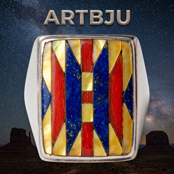 Ring in Sterling Silver/925 hand chiseled and set with mother-of-pearl, black jet, red coral and turquoise.