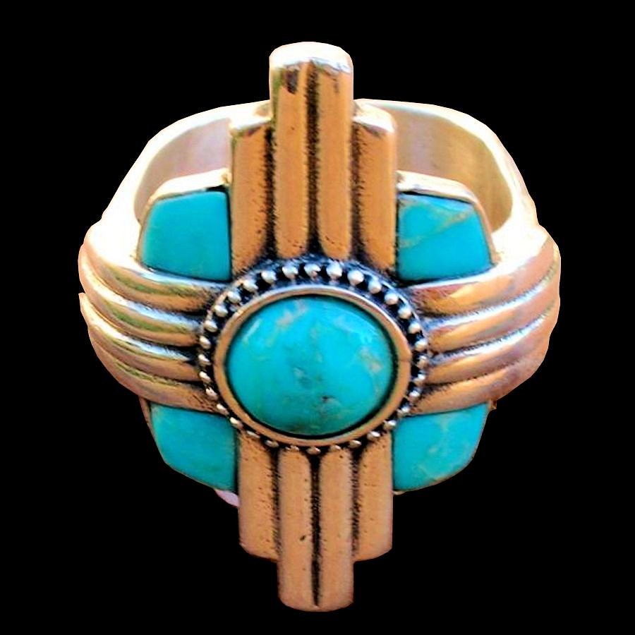 Sterling Silver ring adorned with a navajo symbol. Choice of cabochon and background color.