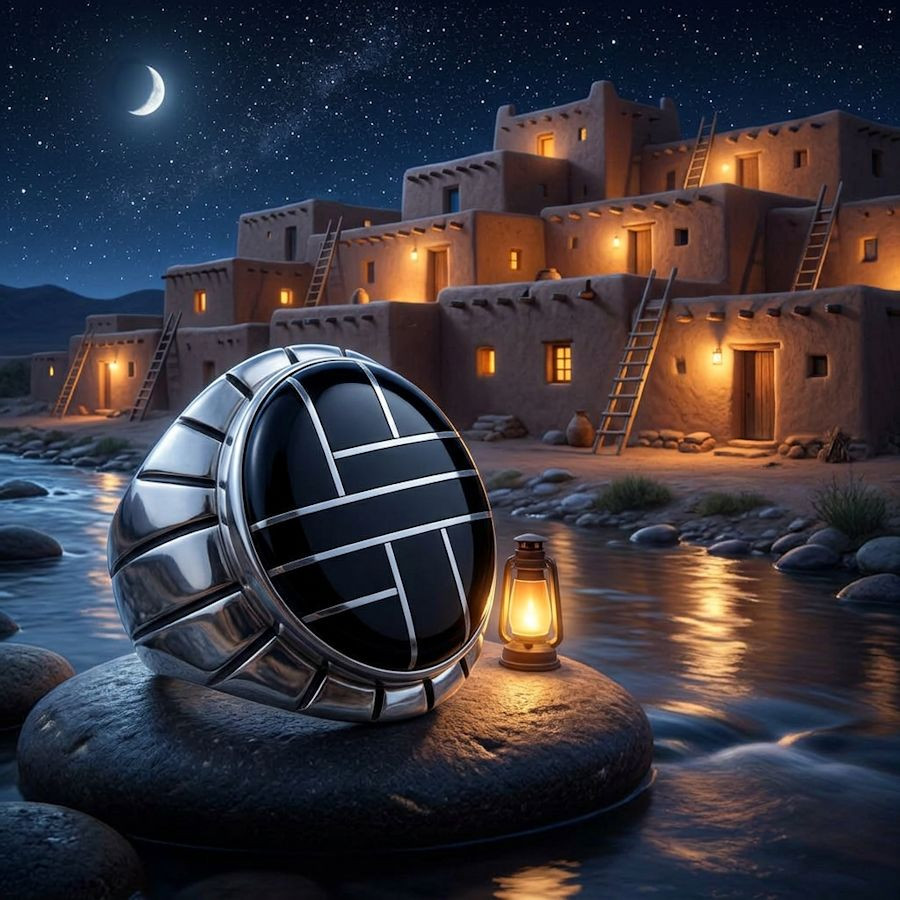 This men's oval ring, crafted in sterling silver, features a stone set between small silver bands. This design is known as an inlay in the jewelry of the American Southwest Native Americans.