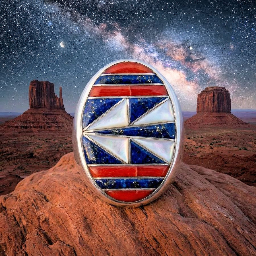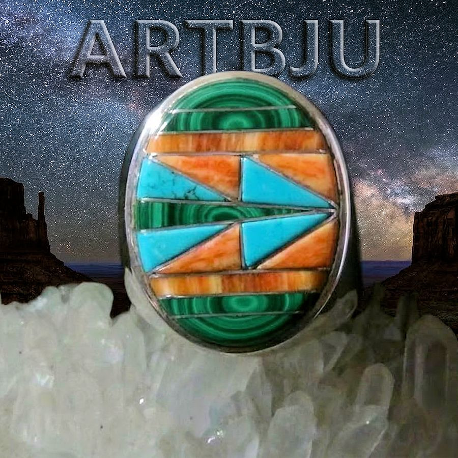 Sterling silver ring set with turquoise, mother-of-pearl, and black shell.
