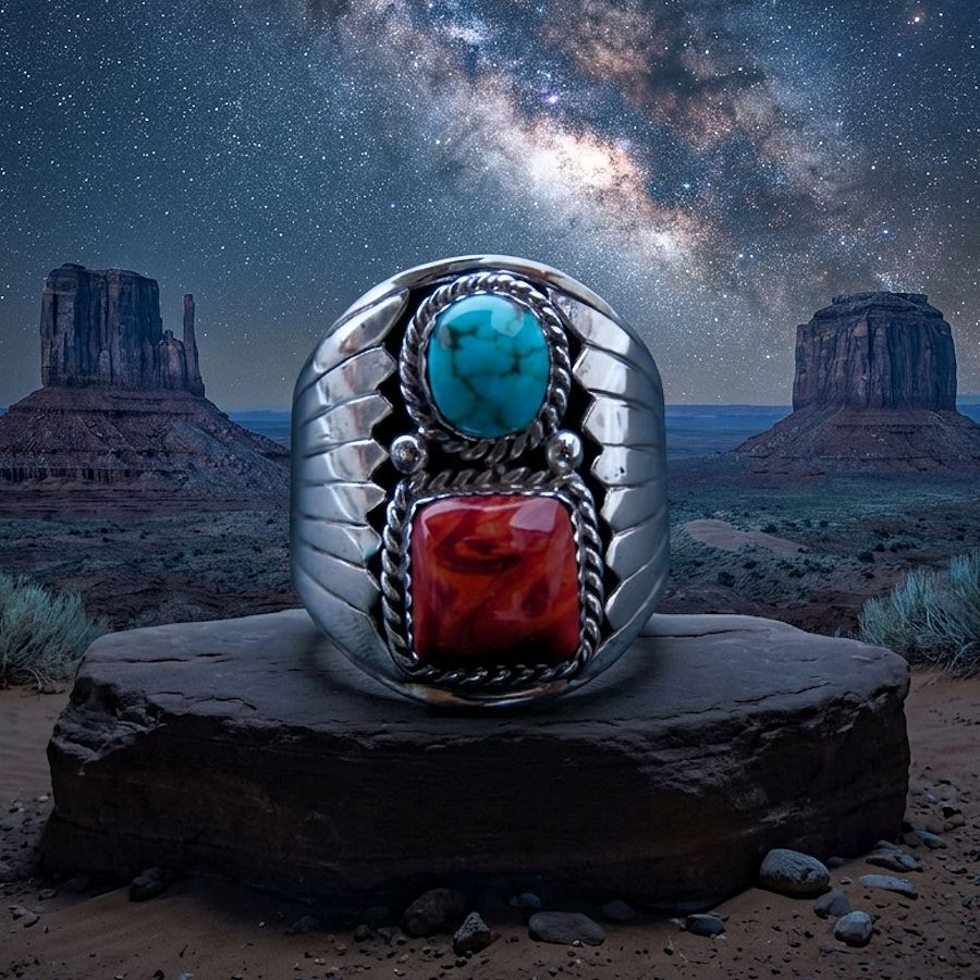 Navajo turquoise and coral rings are iconic handcrafted jewelry from the American Southwest, often combining traditional carved designs with natural stones and pairing the blue-green of turquoise with the crimson red of coral. They are prized for their cultural significance and quality.