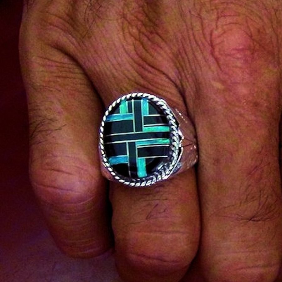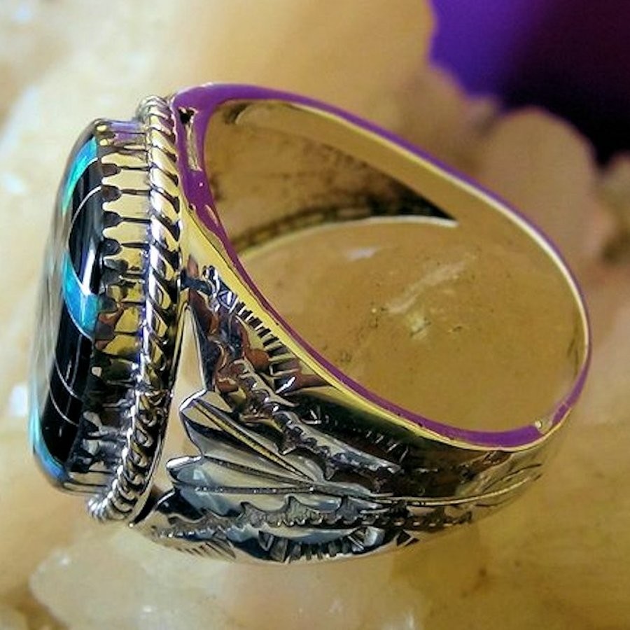 Oval Ring in Silver, Zuni, Channel Inlay, Opal and Black Jeais