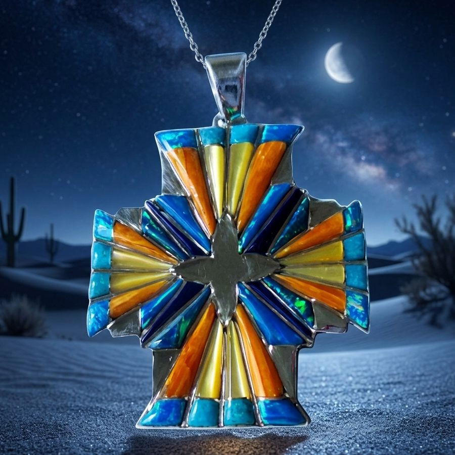 Elevate your jewelry collection with this stunning handcrafted Navajo Cross pendant. A true masterpiece of Native American craftsmanship, this piece blends spiritual symbolism with the vibrant colors of the Southwest.