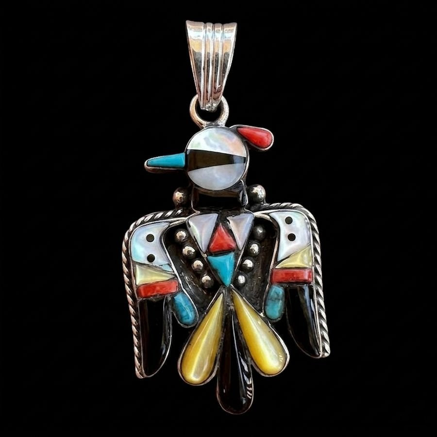 Hand-carved pendant in 925 sterling silver set with multicolored stones.