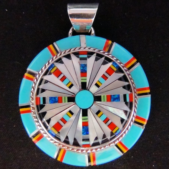 Sterling Silver pendant, with spiny oyster shells and turquoise. In the center: a kashina composed of multicolored semi-precious stones.