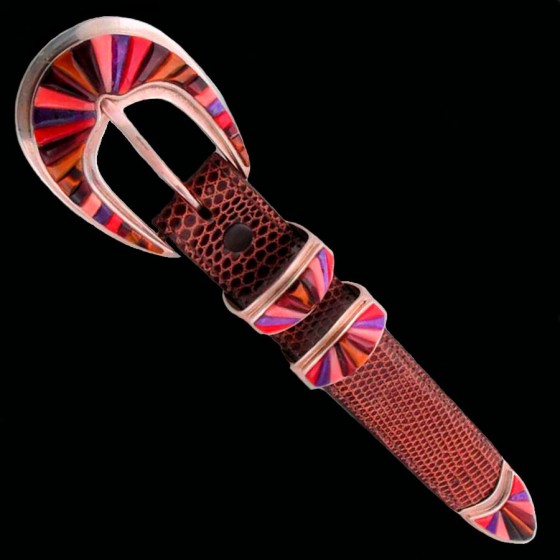 Hand-chiseled Sterlingsilver belt buckle set with semi-precious stones.
