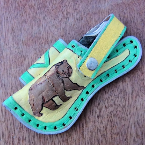 Horizontal sheath in embossed and hand-painted leather for a knife with a maximum length of 12 cm.